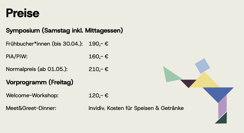 Die TeilnehmerInnen können bis 6 Wochen vor Beginn der Fortbildung zurücktreten. Erfolgt der Rücktritt zwischen der 6. und 3. Woche vor Seminarbeginn, werden 50% der Seminargebühr einbehalten. Unter 3 Wochen behalten wir den gesamten Betrag ein.Rücktrittsbedingungen Symposium:
